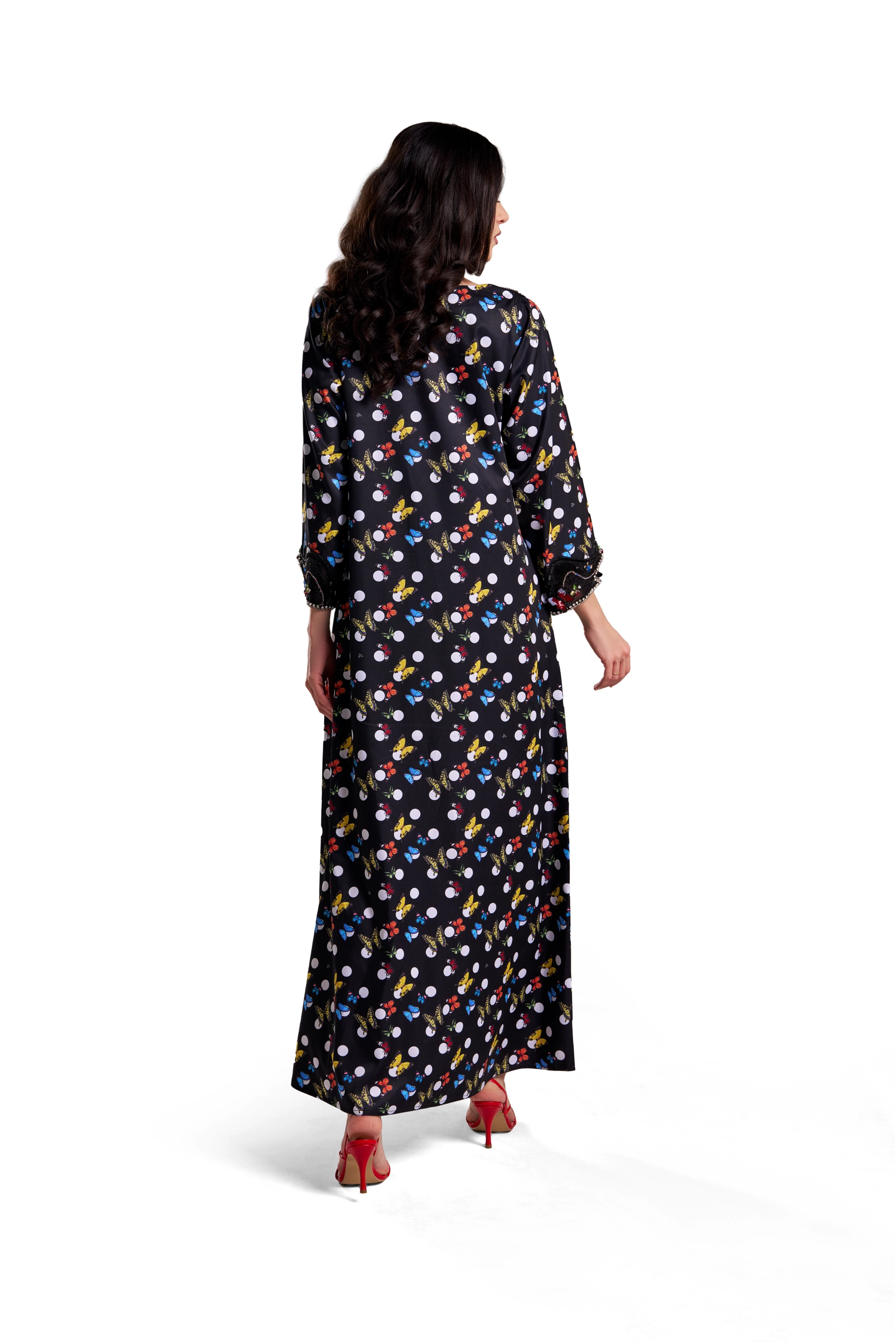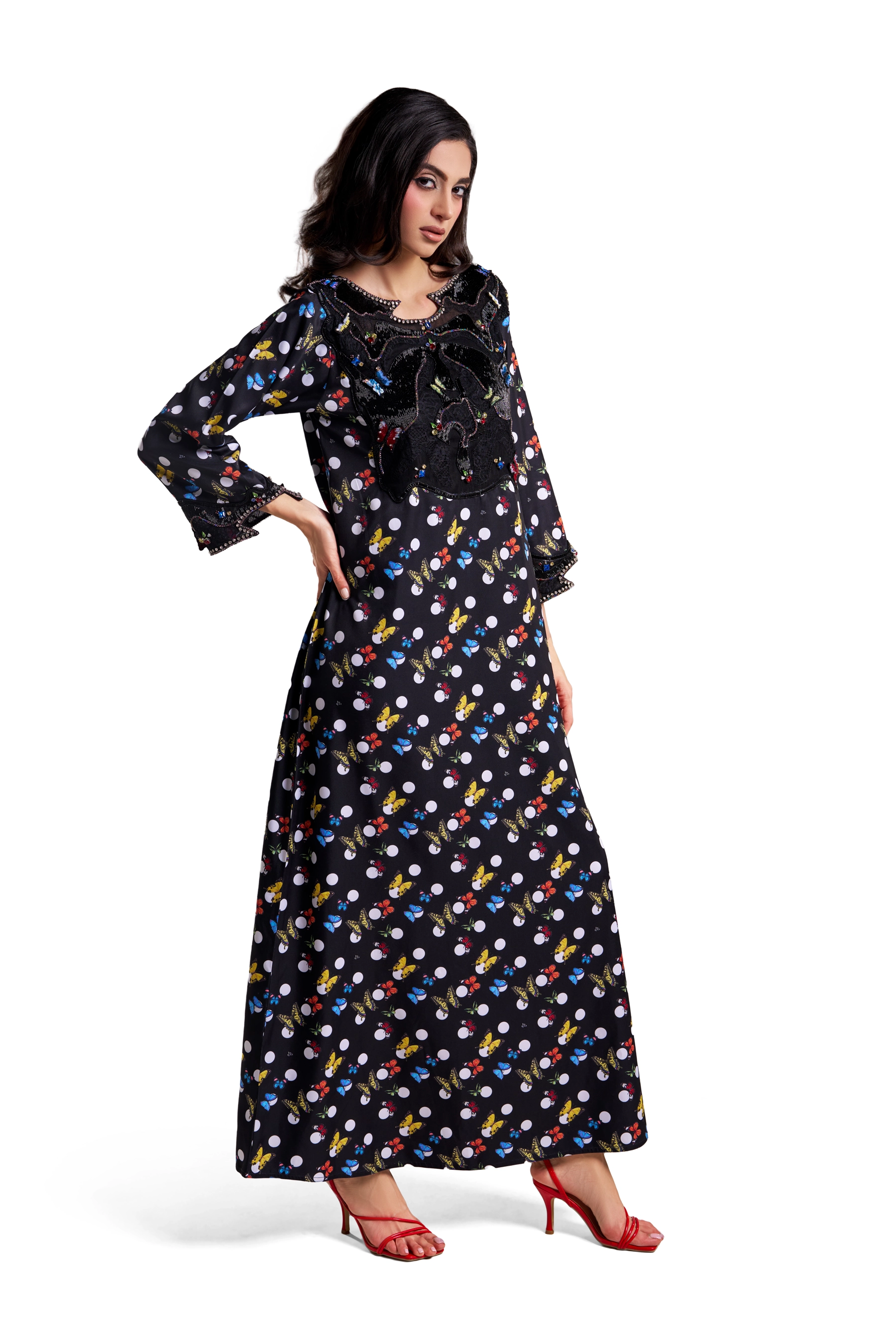 Crafted from custom-printed poly twill, this black kaftan blends polka dots with vibrant butterflies. The bodice includes hand embroidery using Japanese beads, rainbow crystals, tulle, dantelle, and hand-made 3D butterflies layered over black embroidery.
