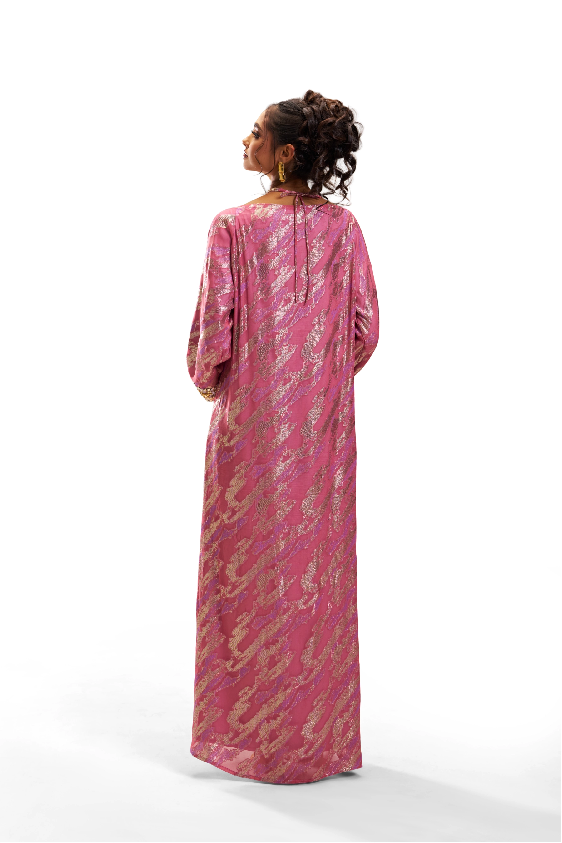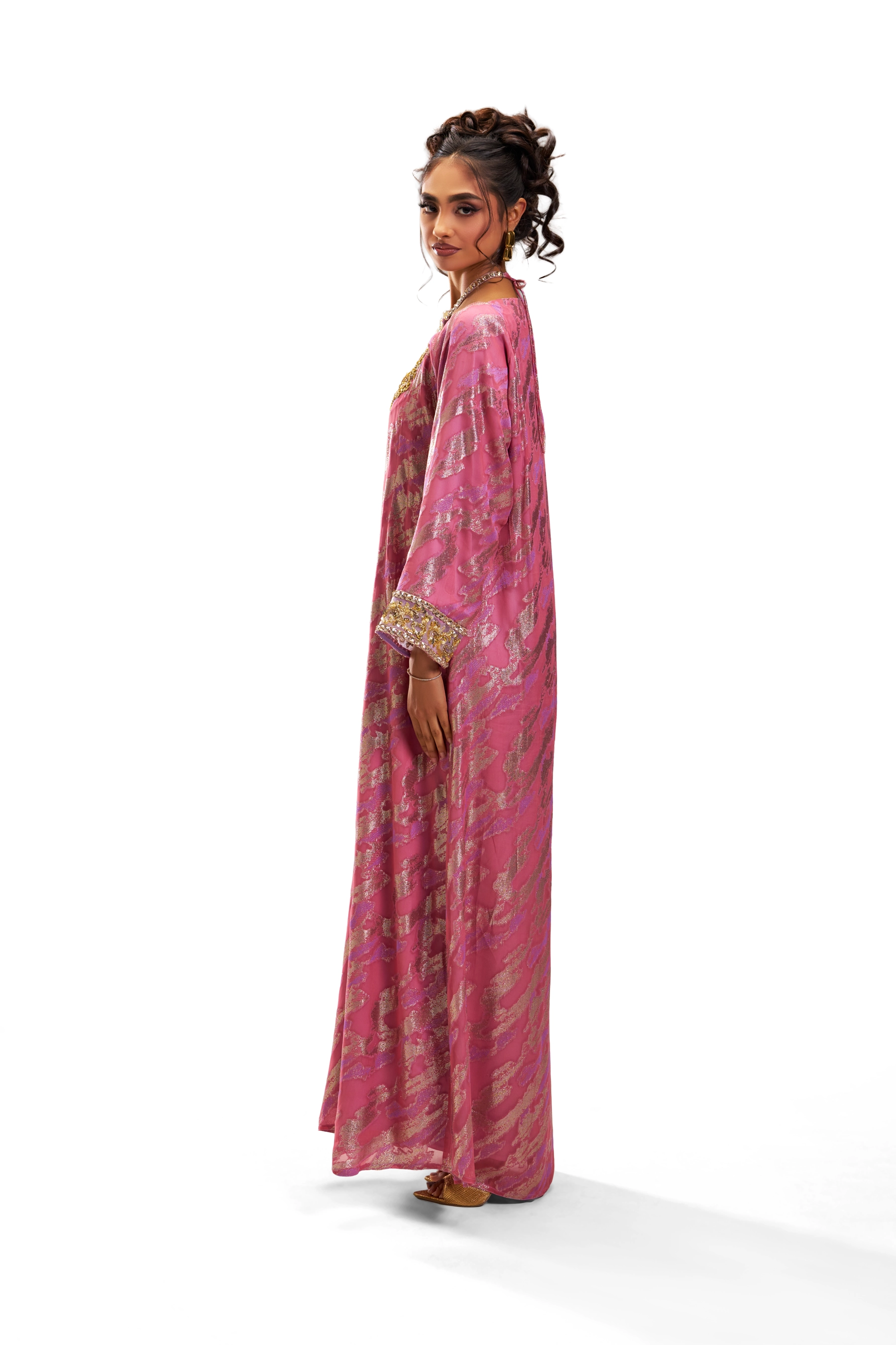 Made from pure viscose chiffon woven with golden threads, this pink kaftan features an ornate neckline embroidered with metallic gold threads, Japanese pearls, gold beads, and high-quality stones arranged around a central pearl. Matching cuffs complete the design.