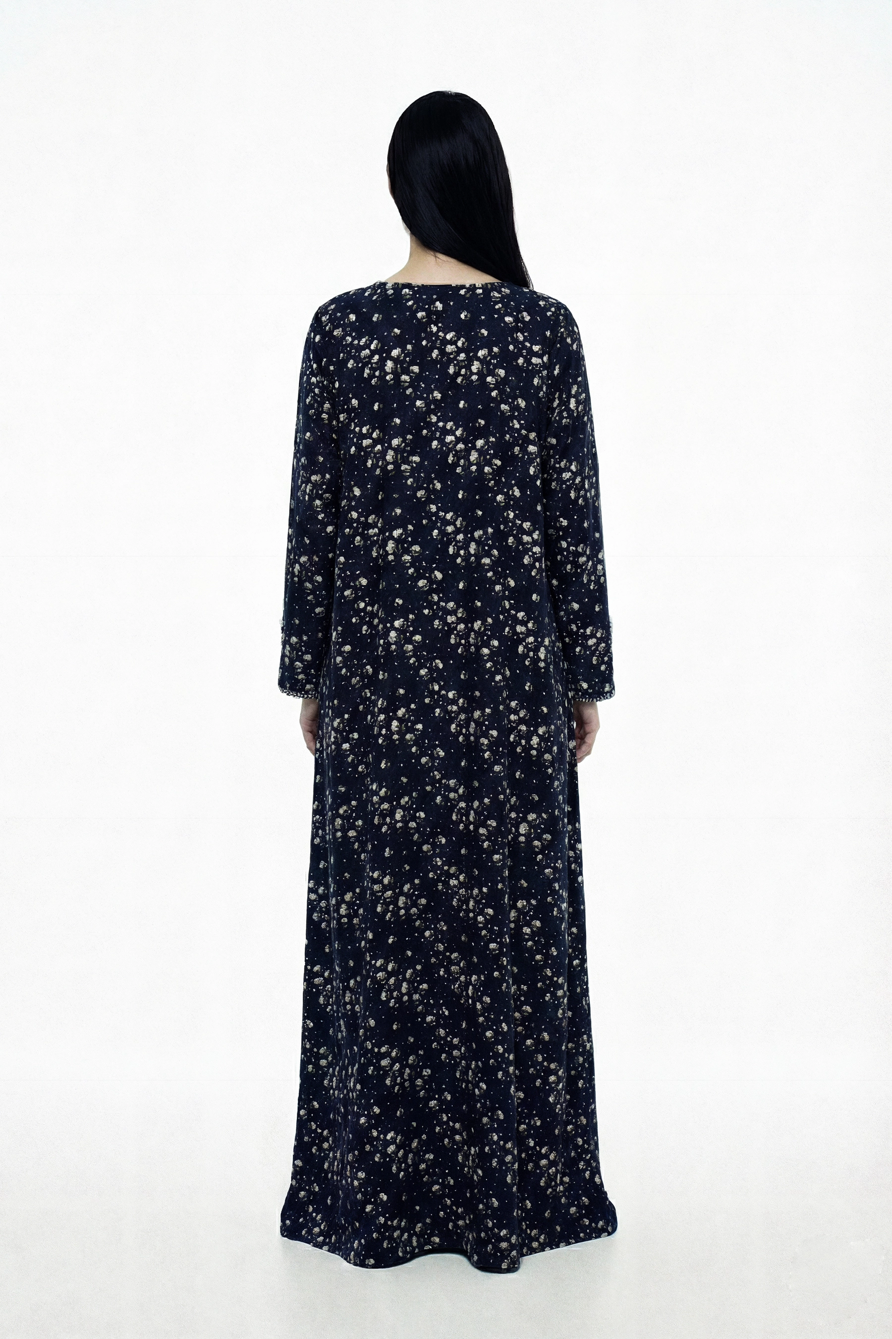 A deep blue kaftan adorned with raised ivory florals and intricate beadwork, crafted from custom poly twill silk for a refined, modern elegance.