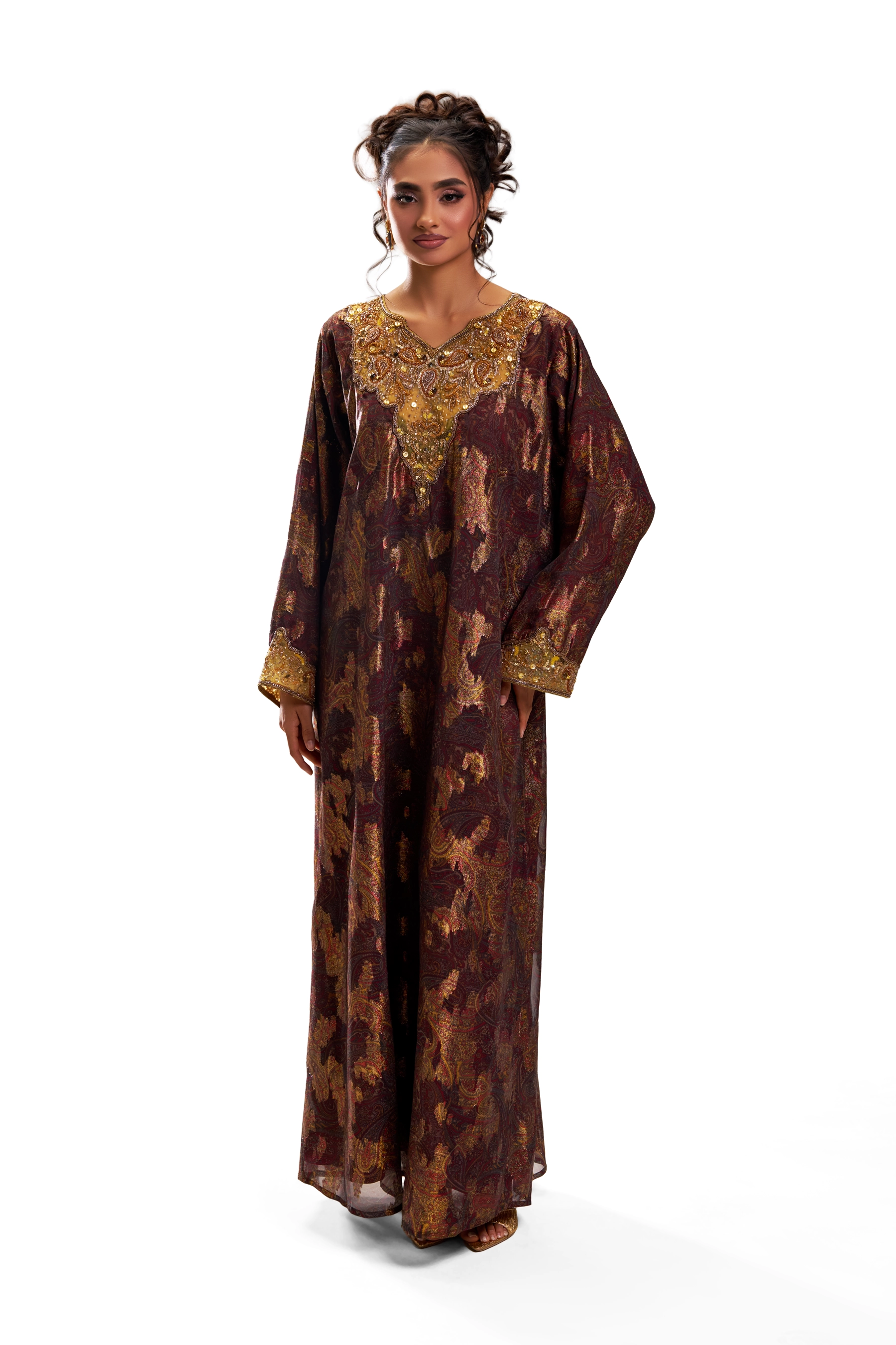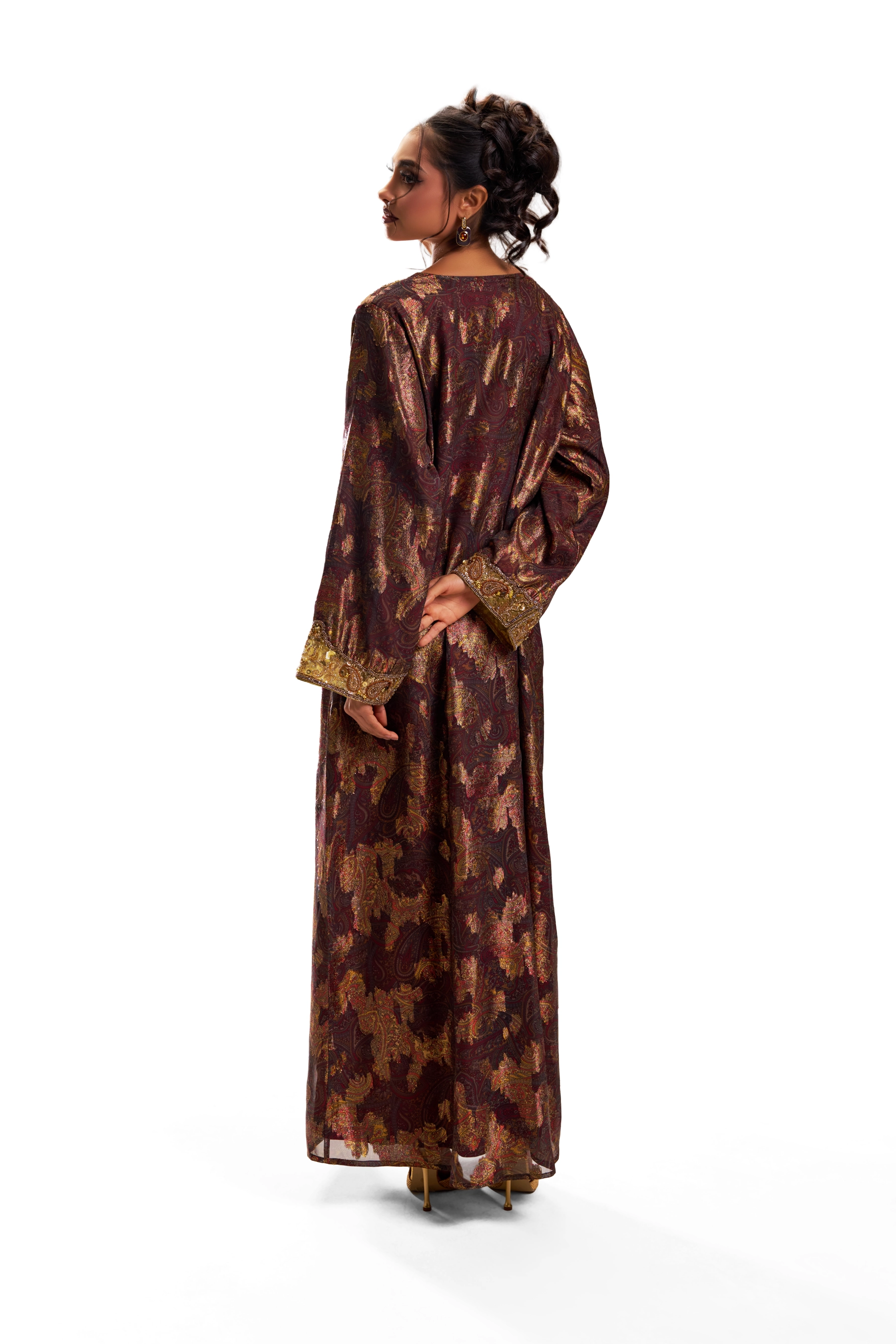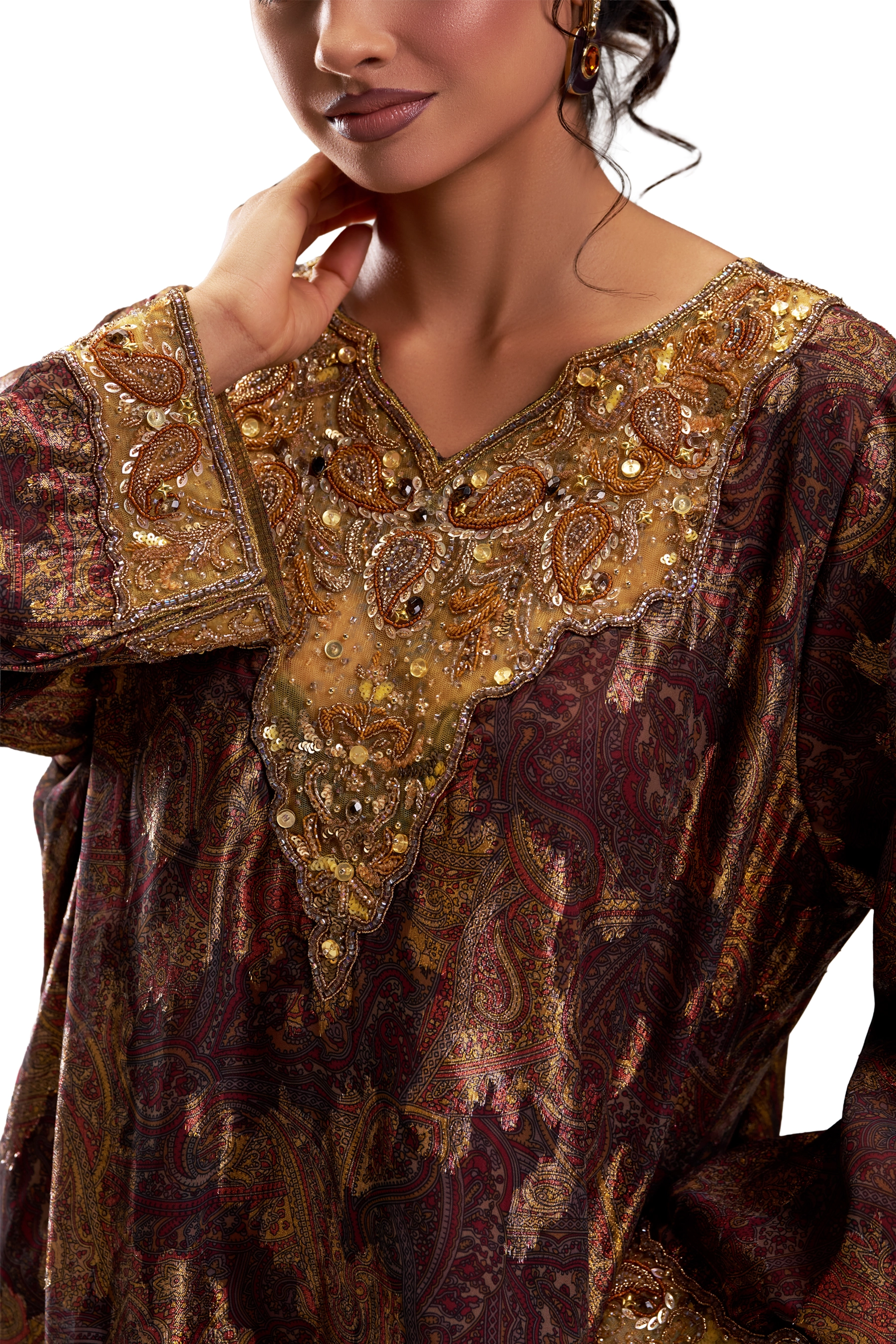 Crafted from poly lurex chiffon featuring an exclusive metallic paisley print, this bronze kaftan includes hand embroidery in gold threads and Japanese glass beads. The layered paisley motifs enhance the richness of both the placement and the fabric.
